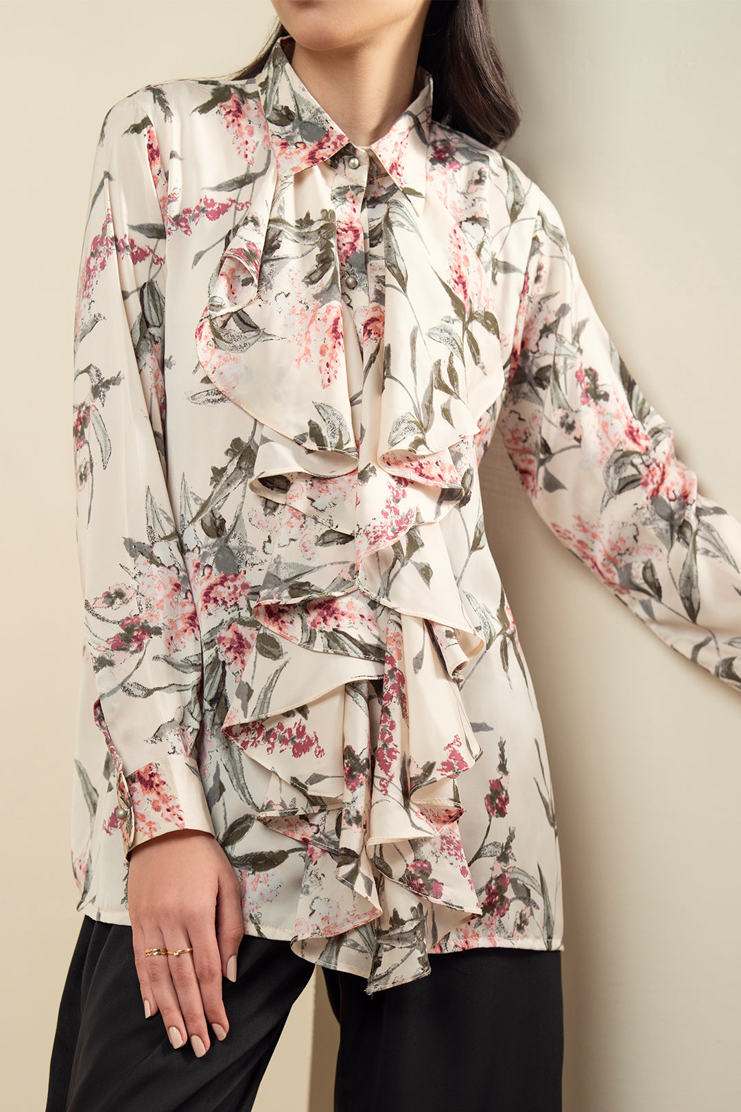 Fit type: RegularDesign Detail: Ruffled button down shirt with metal button detailing.Stretch: NoneTransparency: MediumHand feel:...