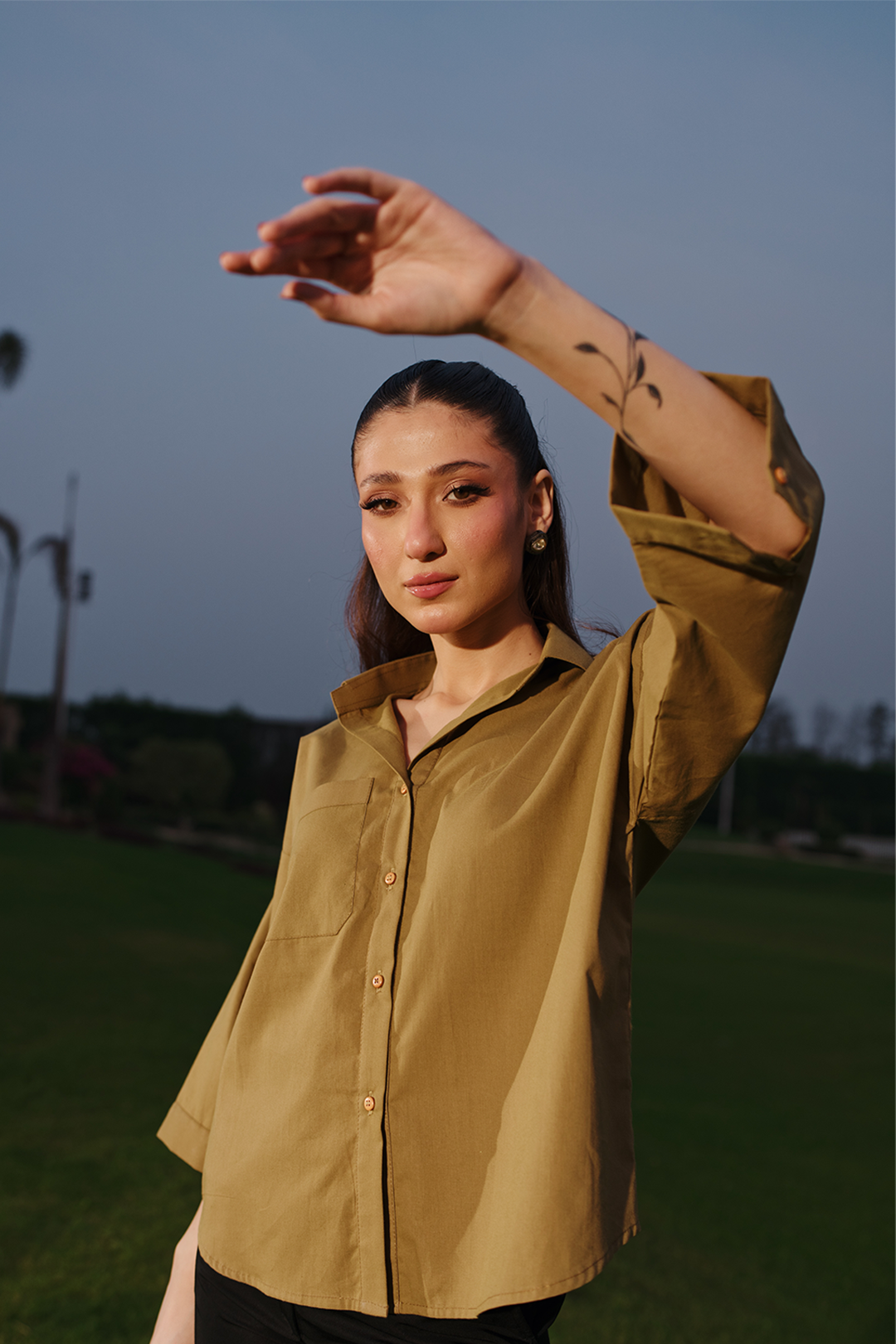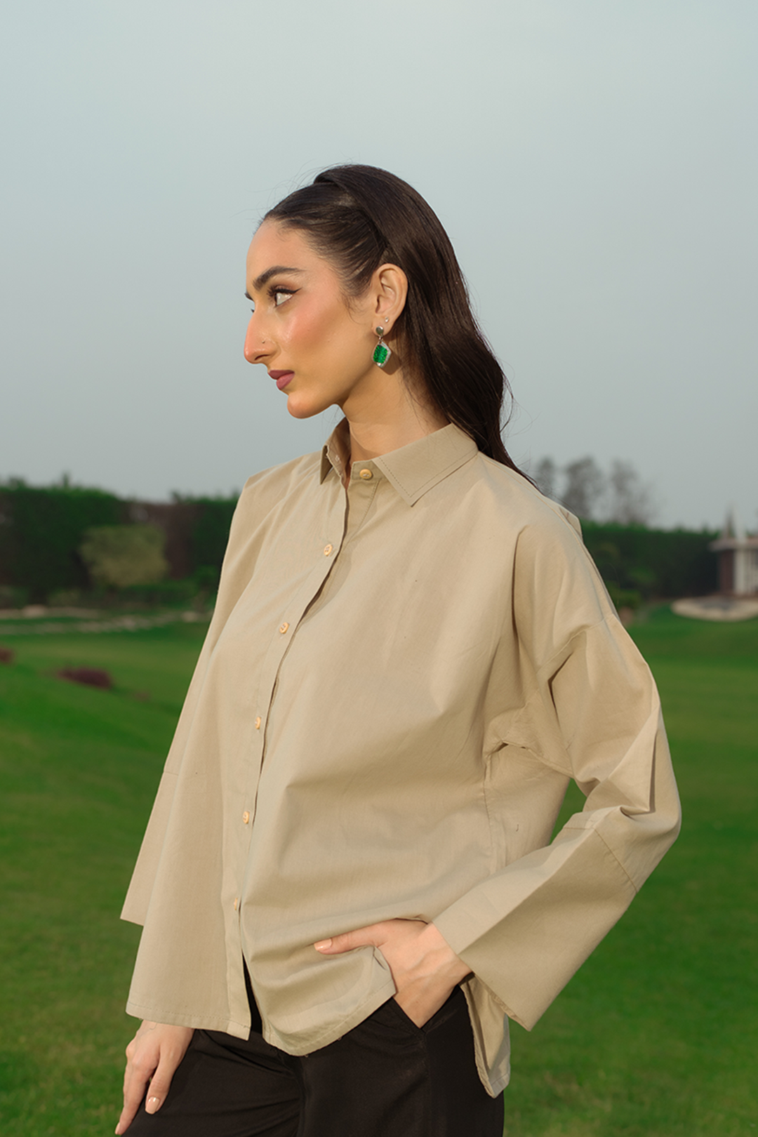 Shirt: Fit type: RelaxedDesign Detail: Band collar shirt with drop shoulder and full sleeve button...