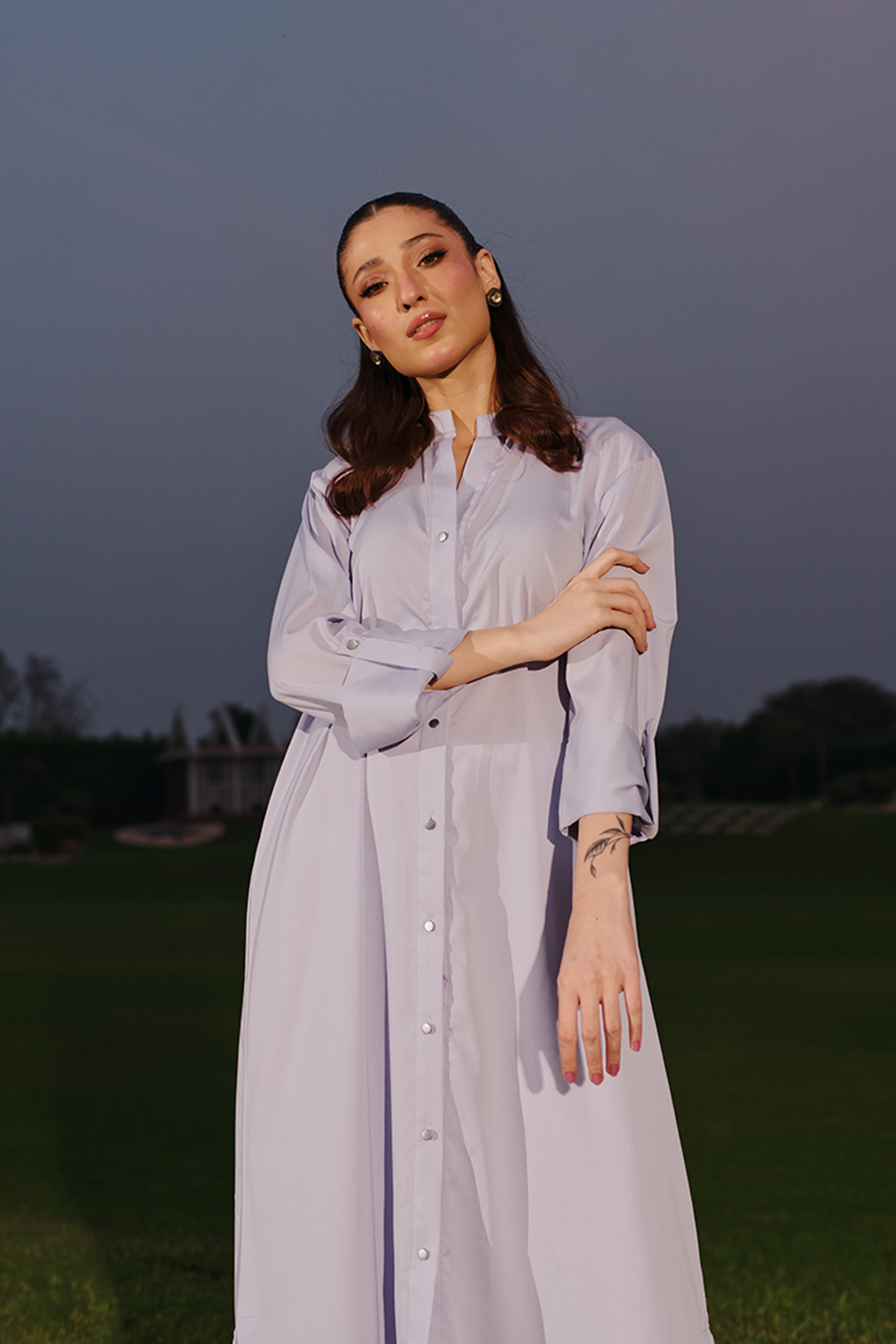 Fit type: RegularDesign Detail: Long dress with a classic collar, button-down front, and folded sleeves...