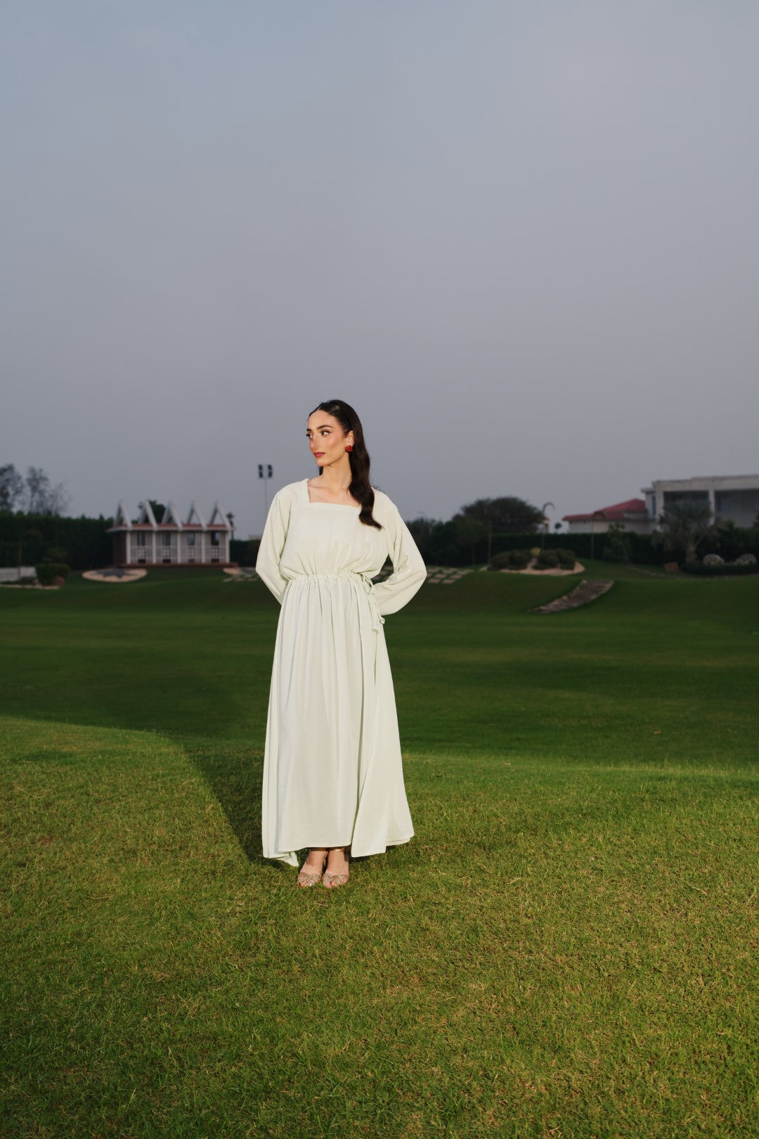 Design Detail: Chic square-neck long dress with a cinched fabric elastic and stylish cuffed sleeves