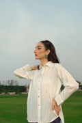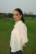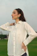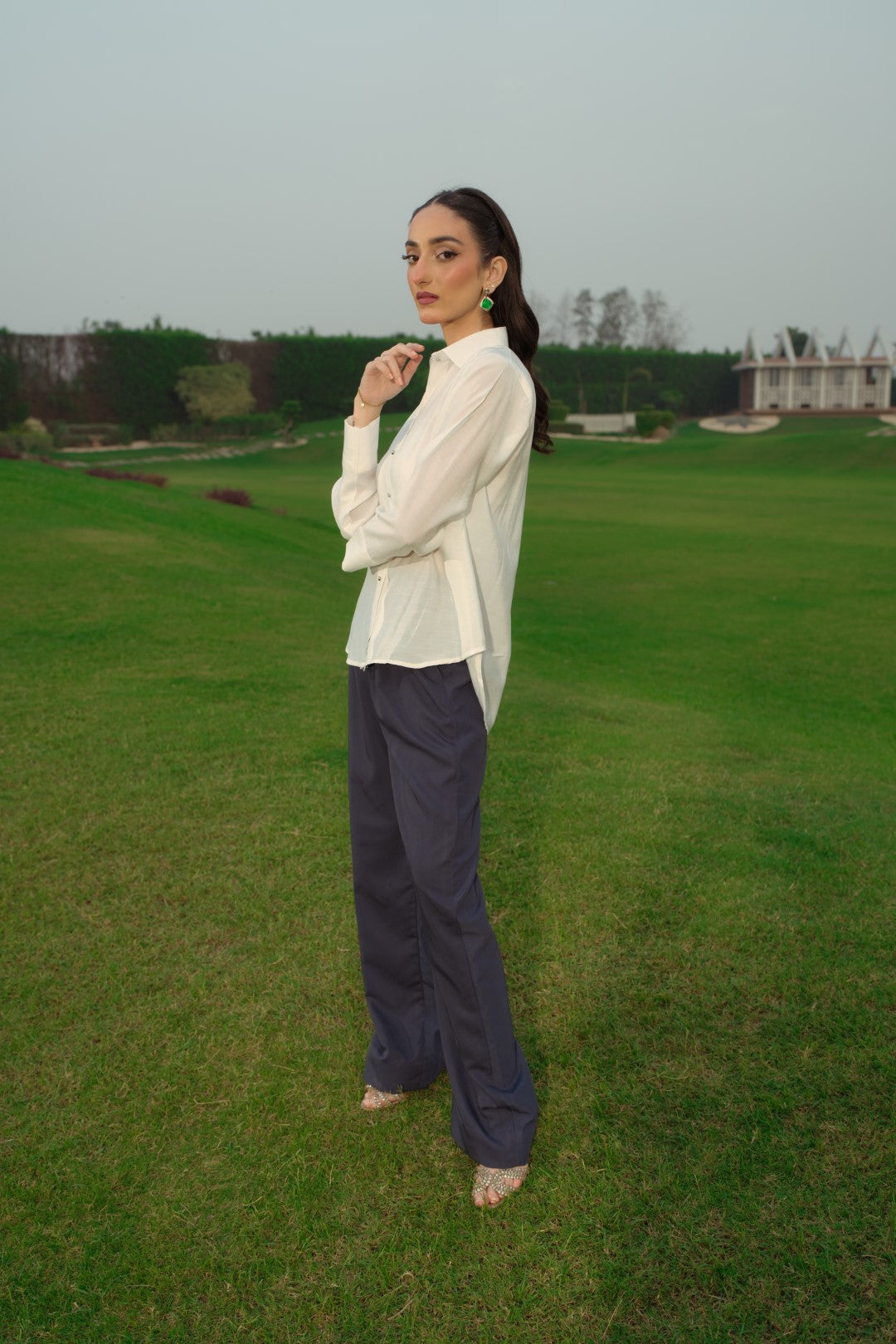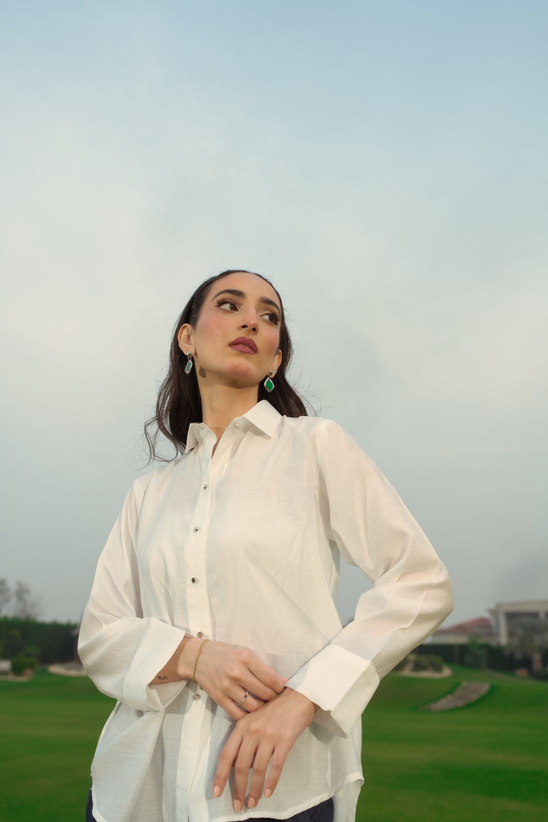 Design Detail: Chic white button-down shirt featuring classic cuffs, a trendy high-low hem, and a sleek tailored front