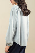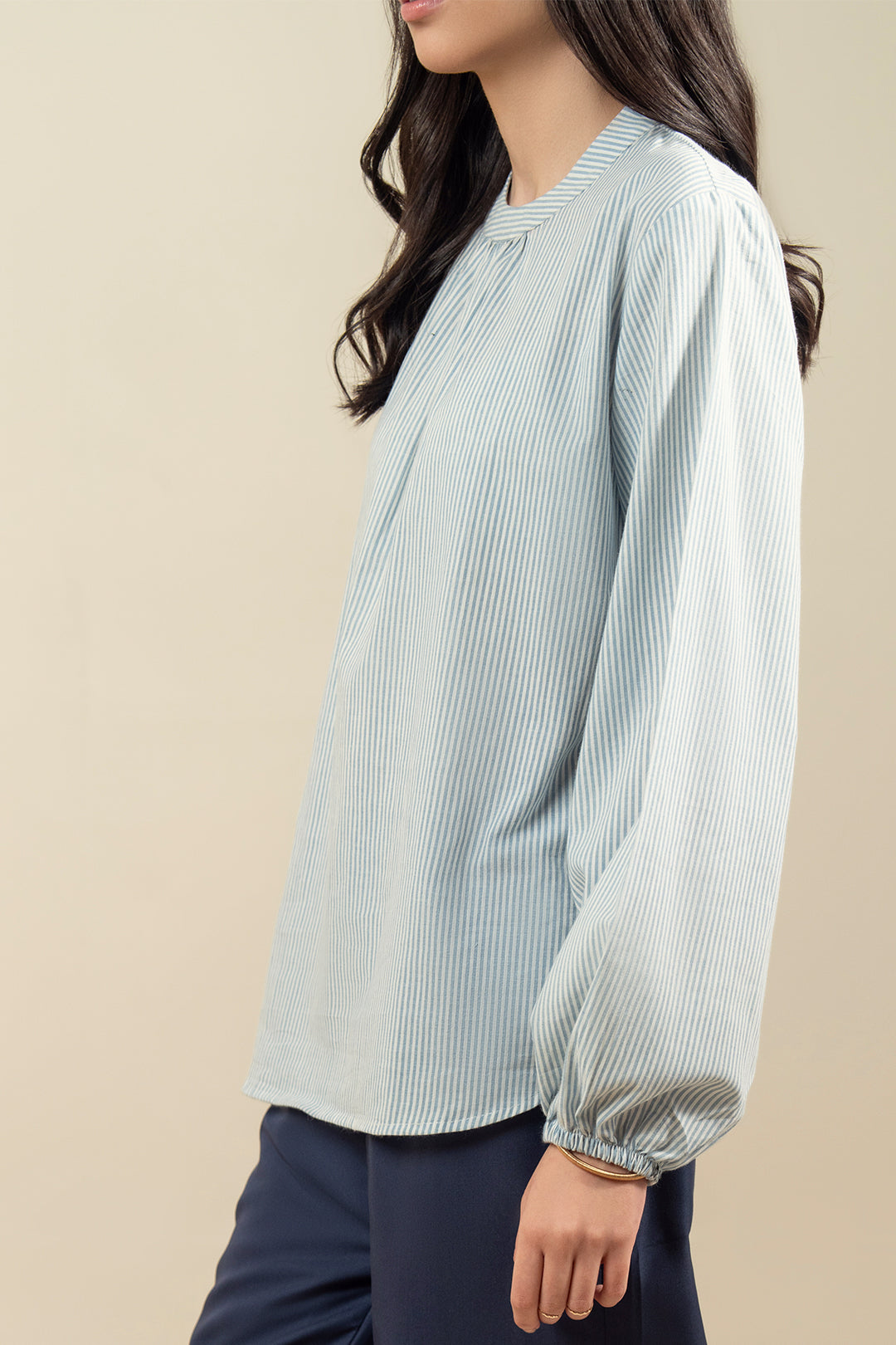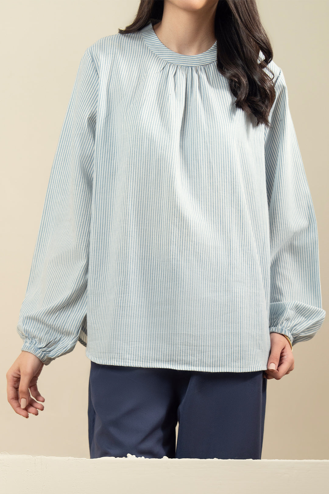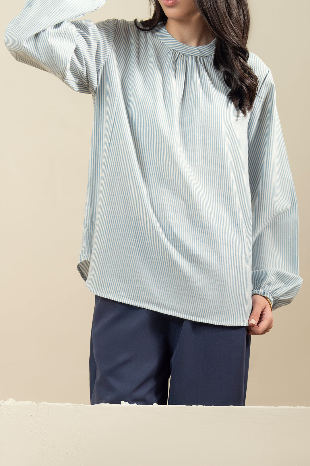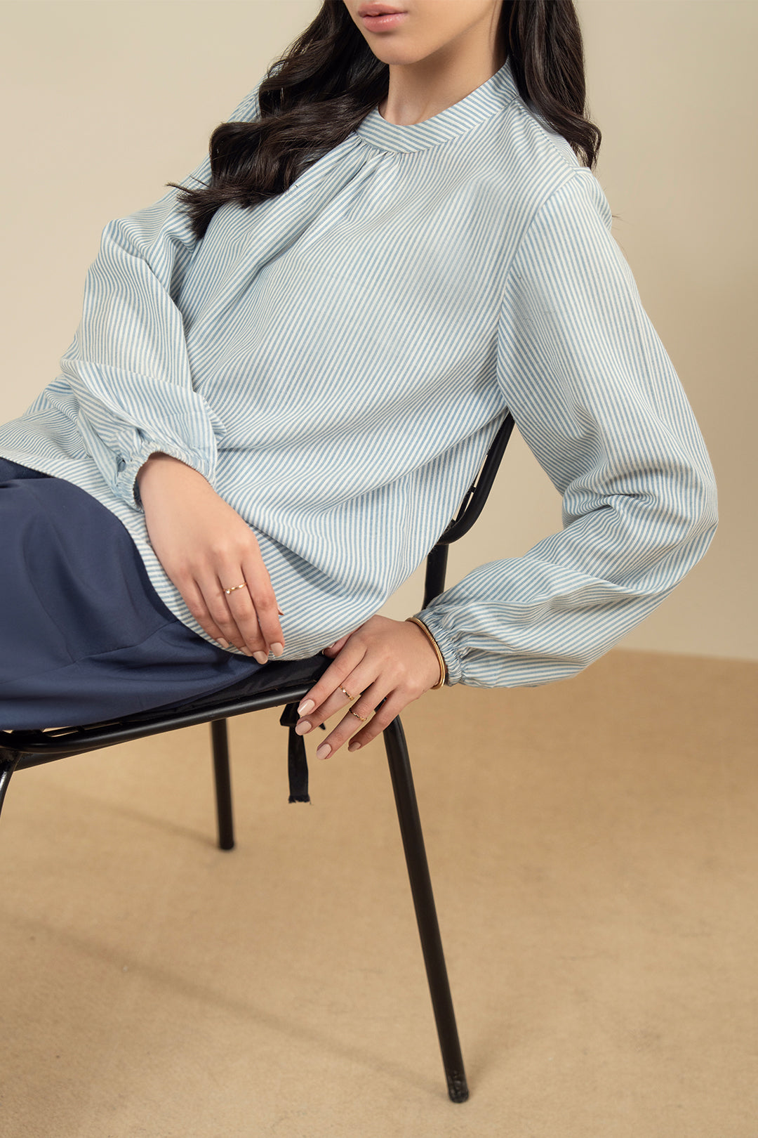 Design Detail: Round ban neck shirt with inverted pleat, full length sleeves with elasticized pleated detail.